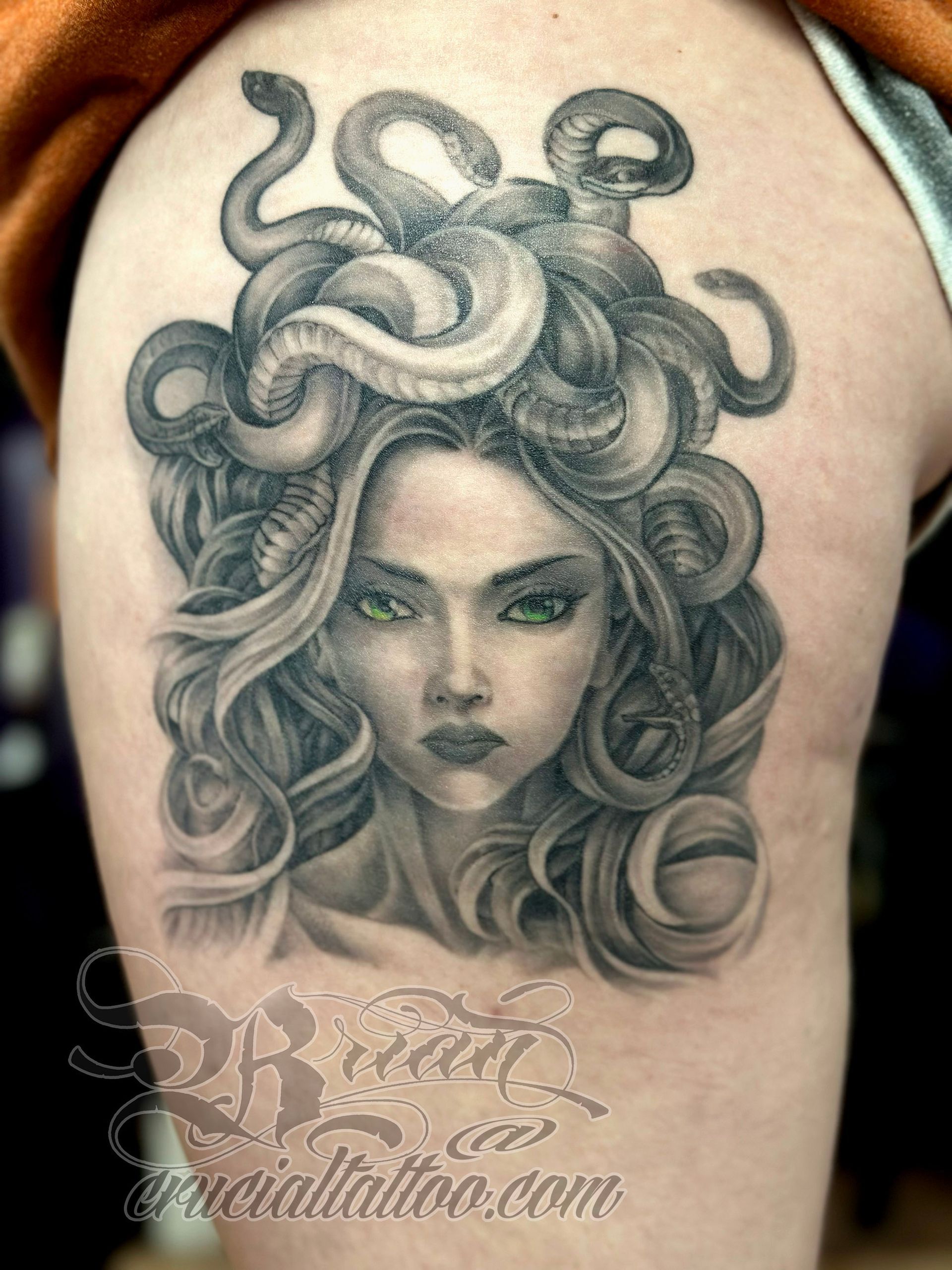 Brian is currently a resident tattoo artist with Crucial Tattoo Studio, and has been tattooing professionally since 2010. His years of tattoo experience accompanied with his previous art knowledge allows him to help his clients visualize and bring their tattoo ideas to life. Brian is versatile in many styles of tattoo, and whether you are looking for a full color design or black and grey style tattoo, leaning on his years of knowledge from color theory and design layout as well as pulling from his love of pop art culture, fantasy art, comic book, anime, pin up, and many more, you are in great hands!