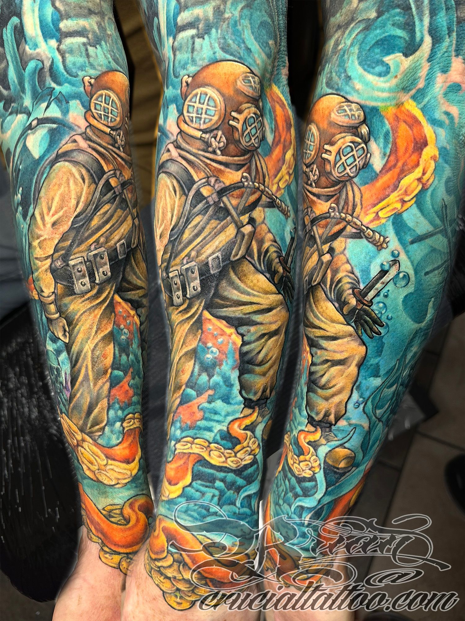His art path eventually brought him to Maryland, where he focused on airbrushing for a local airbrush shop on the boardwalk in Ocean City MD for 16 years. His airbrush skill set provided him access to many different types of custom projects throughout that time. Always looking to push his art talents, he took the advice of a close friend and began looking into a possible career in tattooing. Brian had always held a great admiration for the art of tattooing, recognizing the permanence of it, and the aspect of working on living skin, which brought with it a heightened intensity and challenge. He began his tattoo apprenticeship under Jonathan "Dredd" Kellogg at Crucial Tattoo Studio in Salisbury, MD, quickly realizing that this is where he needed to be in his art career, and welcomed the challenge of adapting his art skills to this new medium.