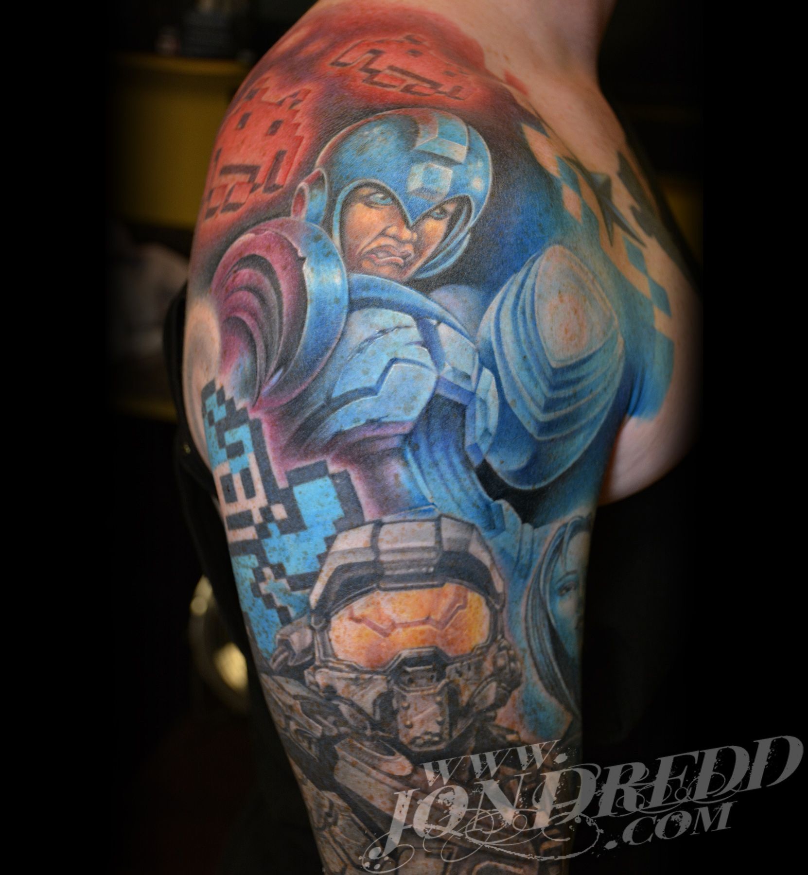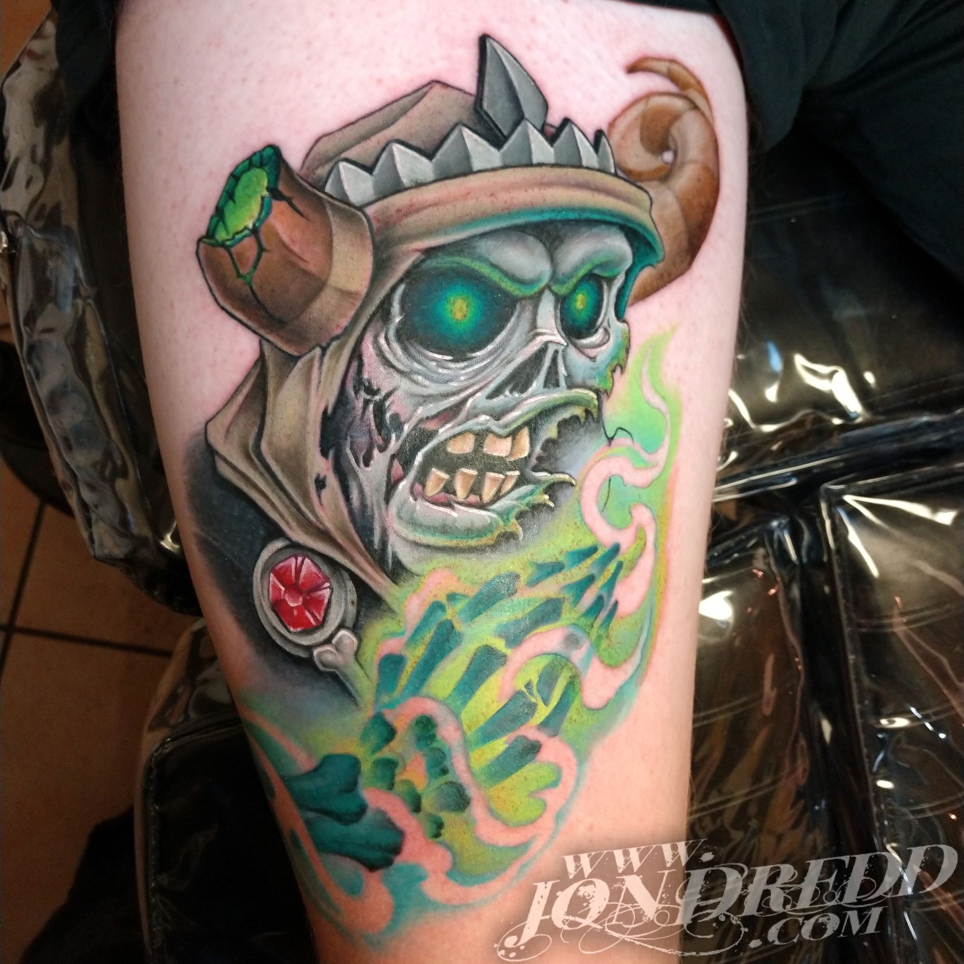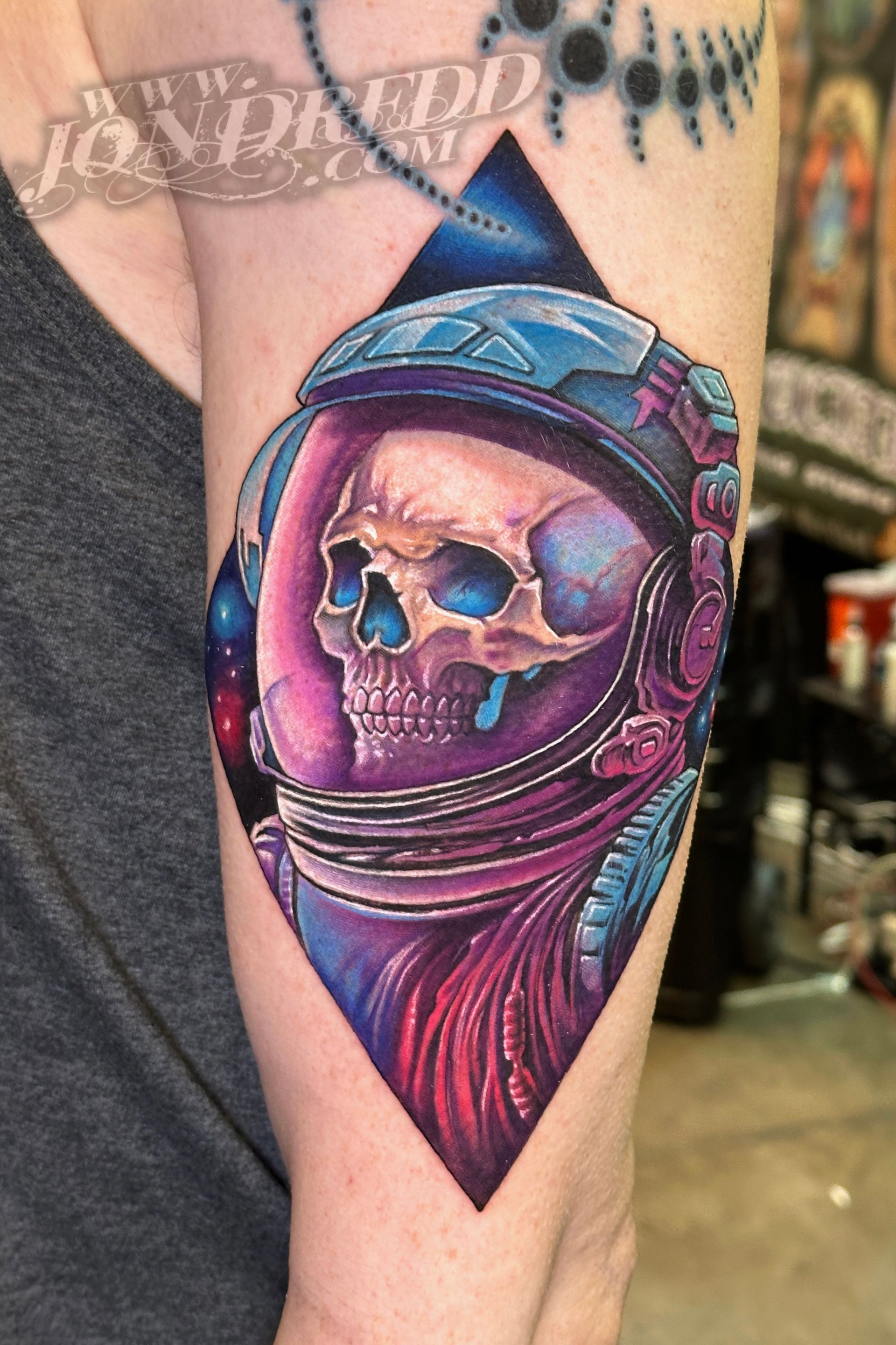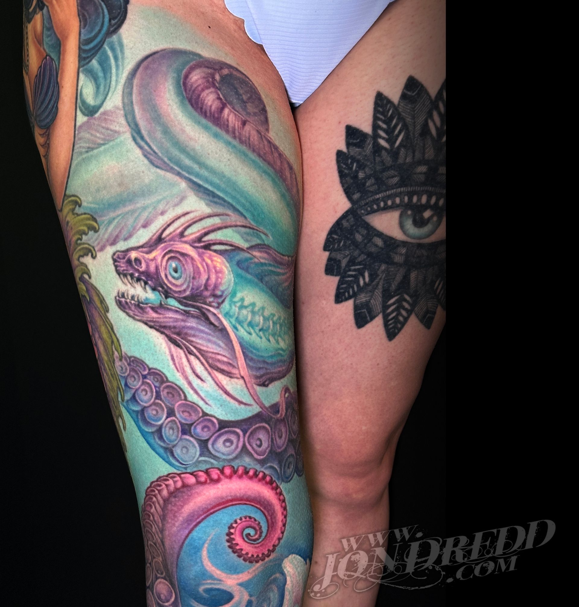 My name is Jonathan Kellogg, but many know me as "Jon Dredd". My earliest memories as a child involve creating artwork with friends, and from a young age, I was known to always have a book of my drawings in tow. I found my early art inspiration through my love for comic books, fantasy art, science fiction, and graffiti, which I still credit to the style of work I do today. I may be best known for my large-scale, full-color work, but I also enjoy tattooing many other styles in addition to that. I started tattooing in 1997, and have spent many years since then devoted to improving my personal tattoo techniques and bringing all of my work to the highest levels possible to provide my unique skill set to all of my clients. I love that every project can have a magical reveal when completed, and am always excited to see how happy both my client and I are with the final outcome. The styles of tattoos I am interested in most are "fantasy", "unrealistic realism", "new school", "bio-work", "celestial", "sacred geometry" work, or anything focused on "imagery telling a story", but I am open to many themes for my tattoo projects. When designing a tattoo, I prefer large bold imagery that flows well with the shape of the body that it's placed on, as well as concepts that consist of multiple layers of content that tell a visual story and flow well with the shape of the body.