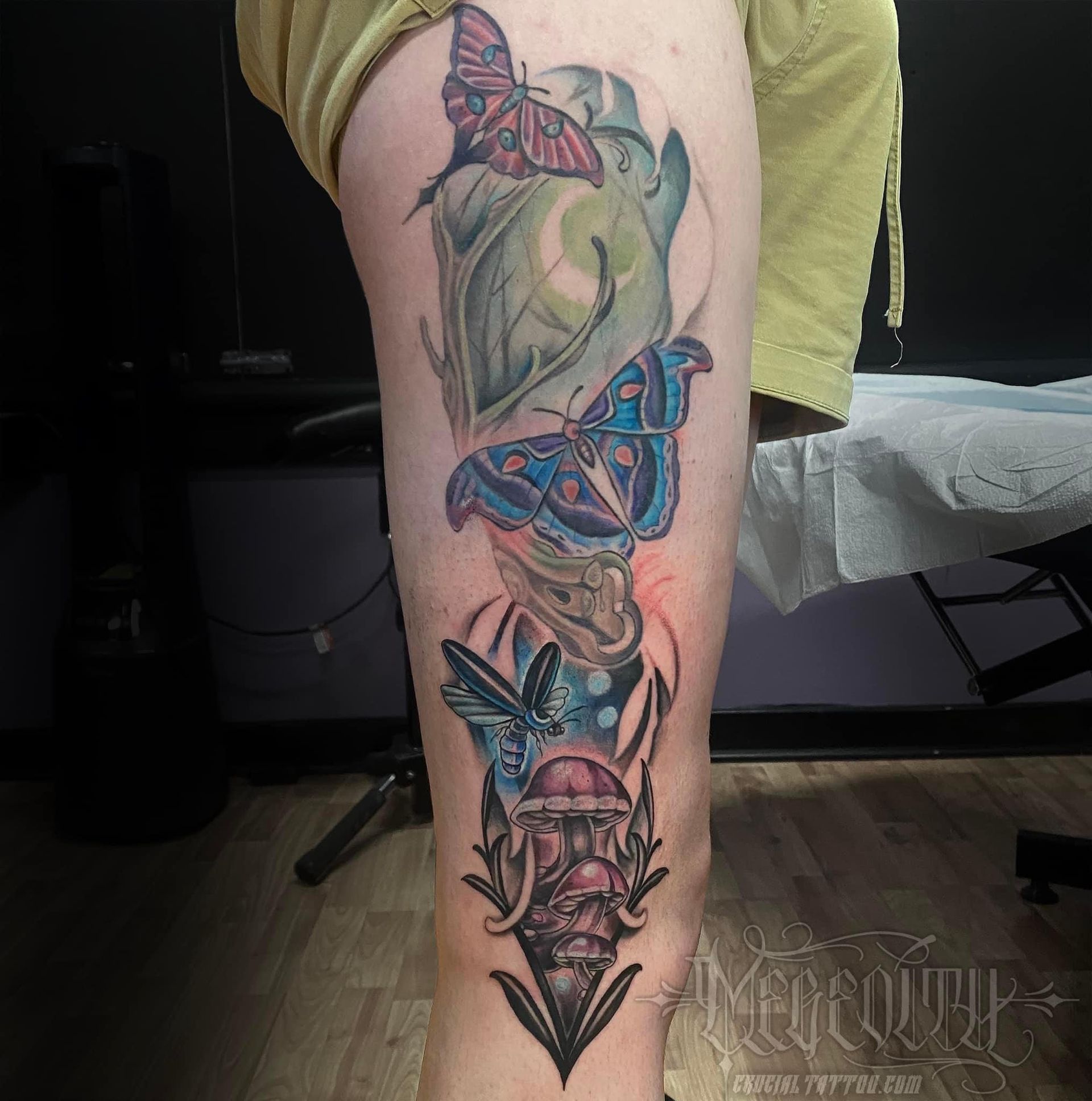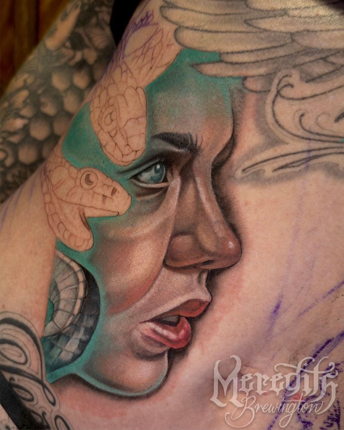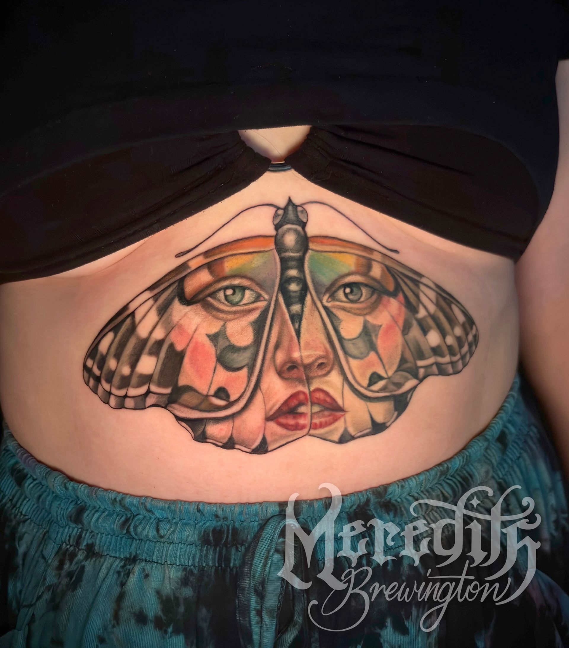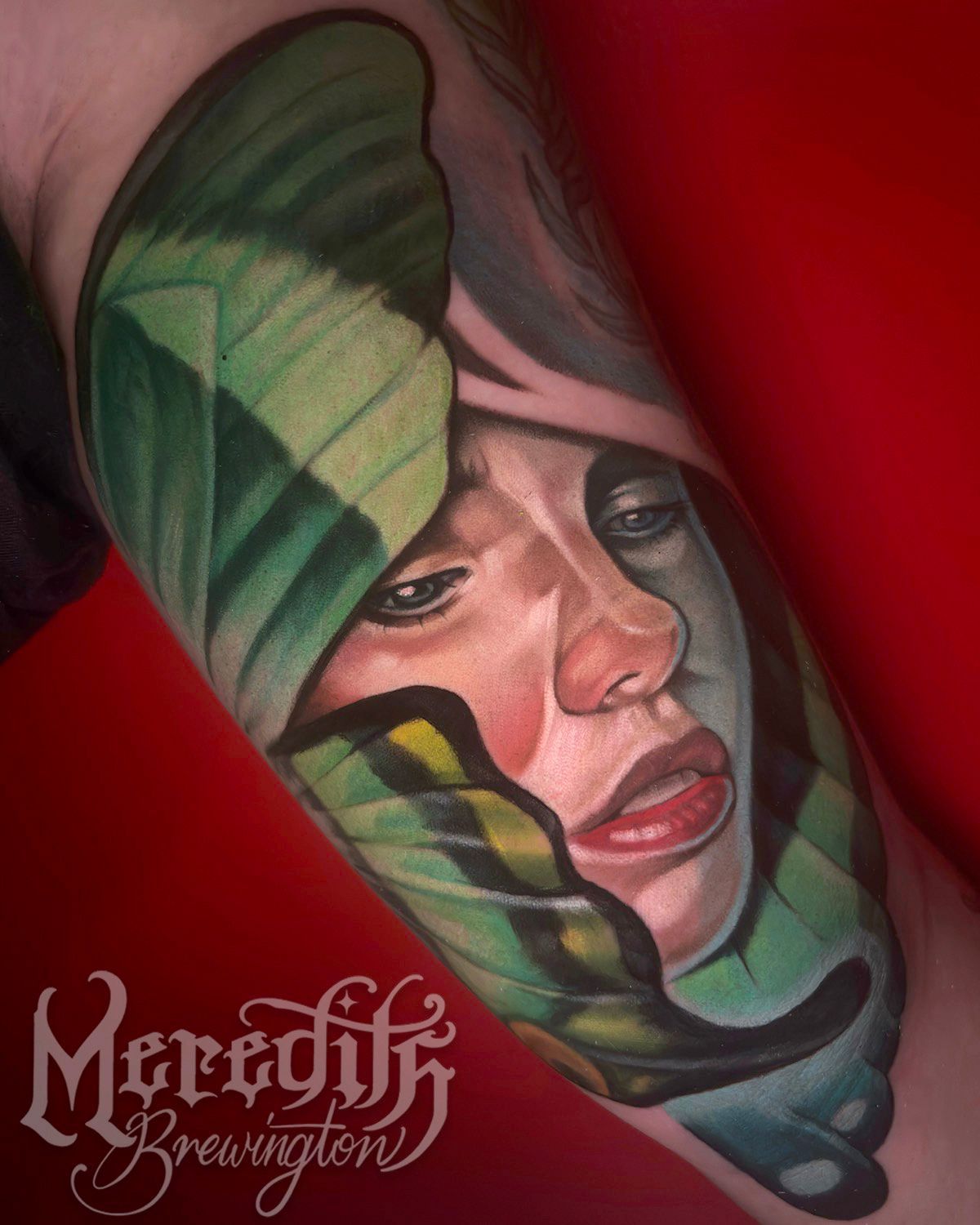 Meredith has a fascination with the natural world and often designs imagery inspired by anything from scientific "real world" illustrations to fantastical magical creatures. She loves being able to tell a story with her work, using mystical backgrounds and strong light sources. Her use of negative space as a design element to create flow can be seen in most of her large-scale work. Meredith's favorite subjects are fantasy figure work, like mermaids, fairies, and fauns. As well as animal portraits or insects in a wide range of styles. While she likes to encompass a broad range of different styles, most of her tattoo work could be categorized as Fantasy, illustrative, and Surrealism.