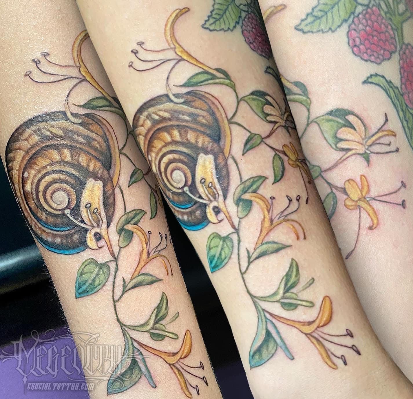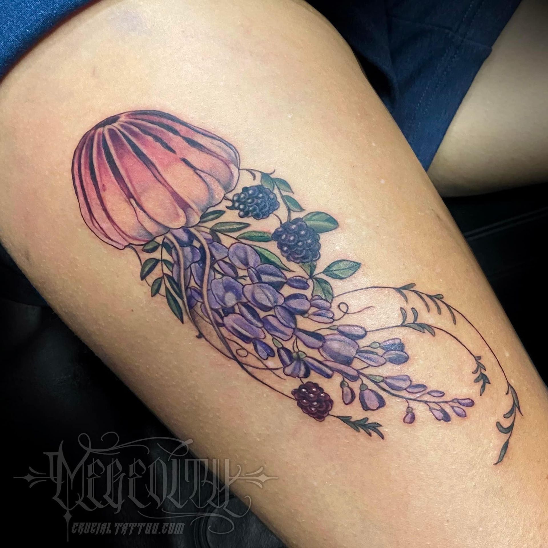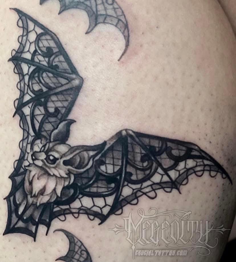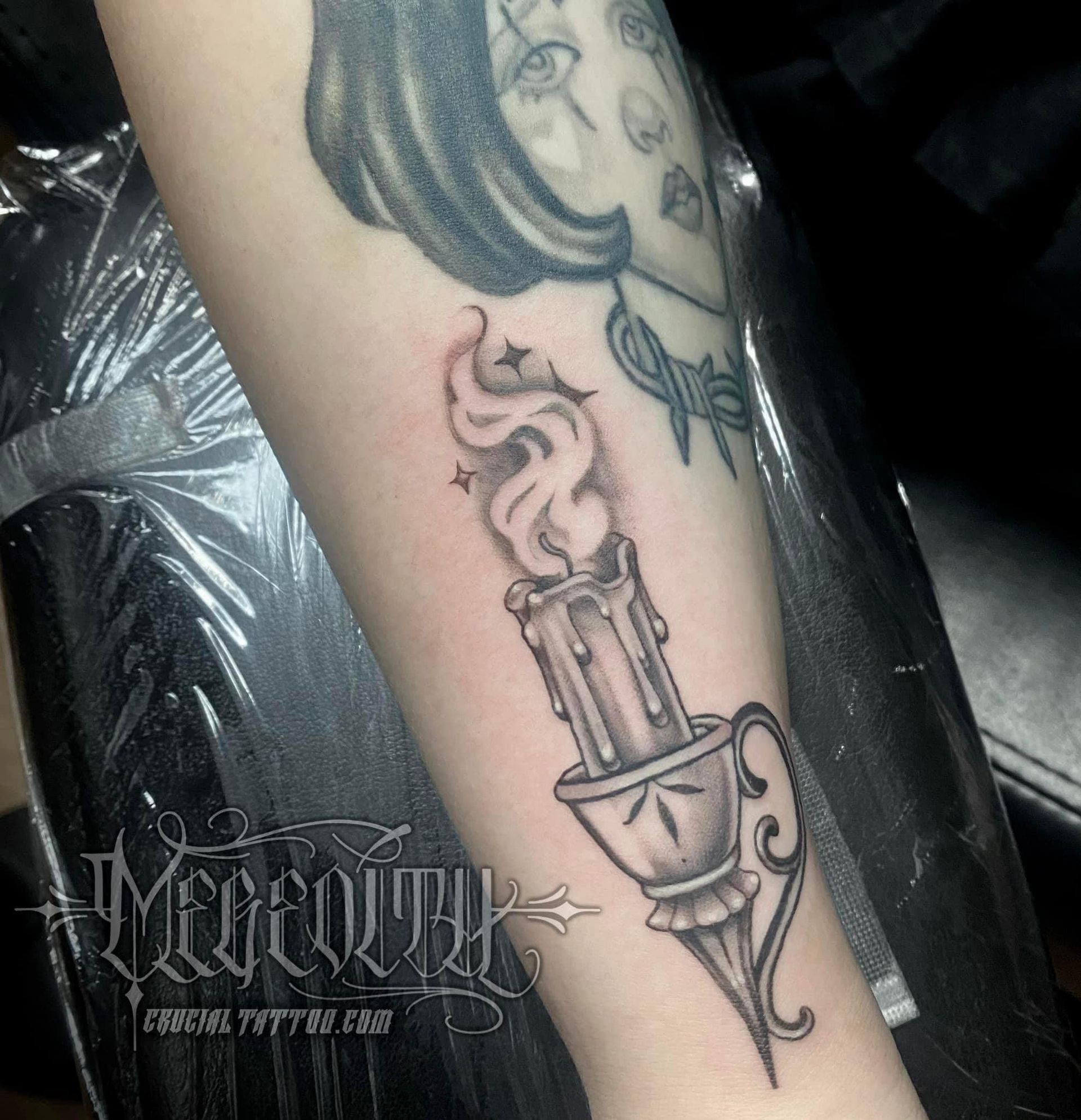 Meredith has a fascination with the natural world and often designs imagery inspired by anything from scientific "real world" illustrations to fantastical magical creatures. She loves being able to tell a story with her work, using mystical backgrounds and strong light sources. Her use of negative space as a design element to create flow can be seen in most of her large-scale work. Meredith's favorite subjects are fantasy figure work, like mermaids, fairies, and fauns. As well as animal portraits or insects in a wide range of styles. While she likes to encompass a broad range of different styles, most of her tattoo work could be categorized as Fantasy, illustrative, and Surrealism.