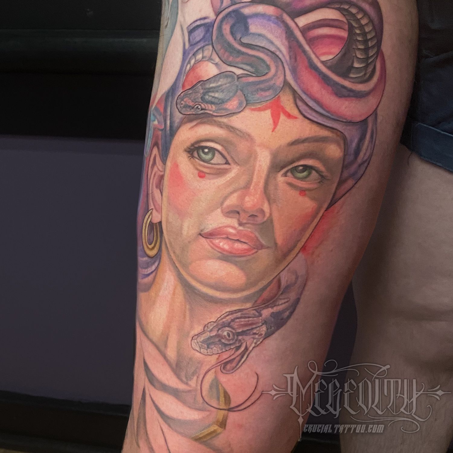 I was born and raised in Salisbury MD, on a farm not far from Crucial Tattoo Studio, and I’ve always used art as a therapy and hobby for as long as I can remember. I eventually became classically trained in portraiture oil painting using the “alla prima” technique and working on still life studies. Due to this, I have a huge appreciation for fine art, which hopefully reflects in my tattoo work with strong compositions and use of color theory.
